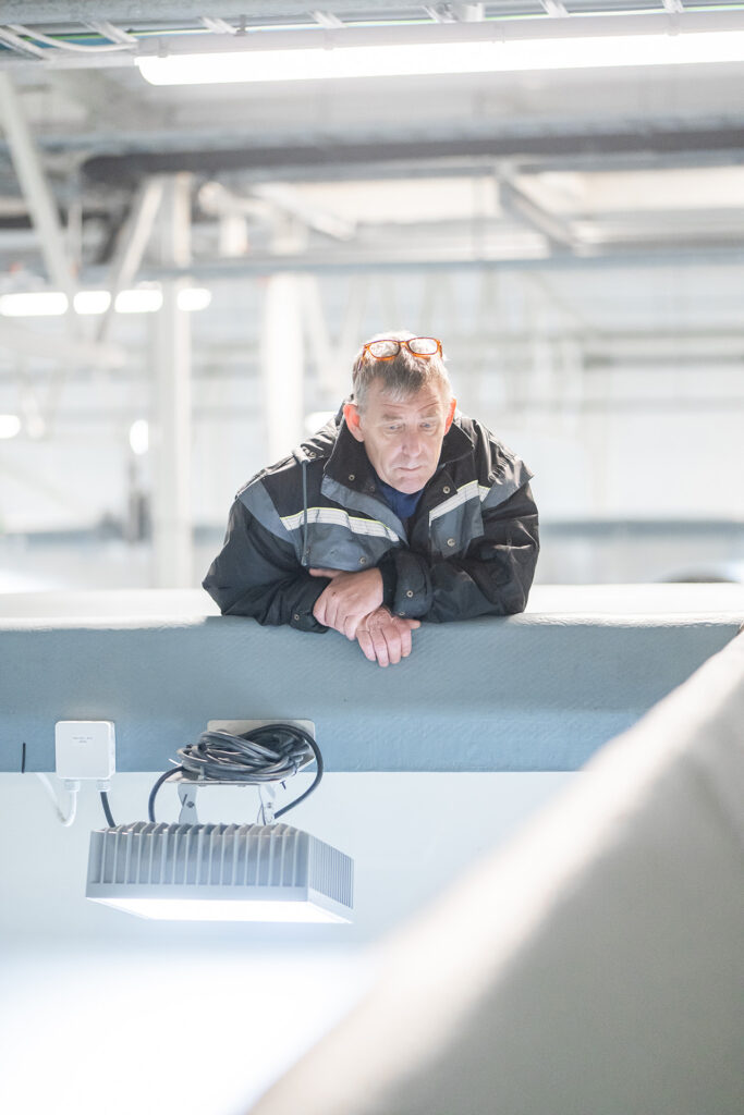 Observing the fish is a key part of the daily work for Kjellesvik and his colleagues. From the walkways, technicians can stand directly above the tanks and closely monitor fish behaviour to ensure optimal feeding and performance.